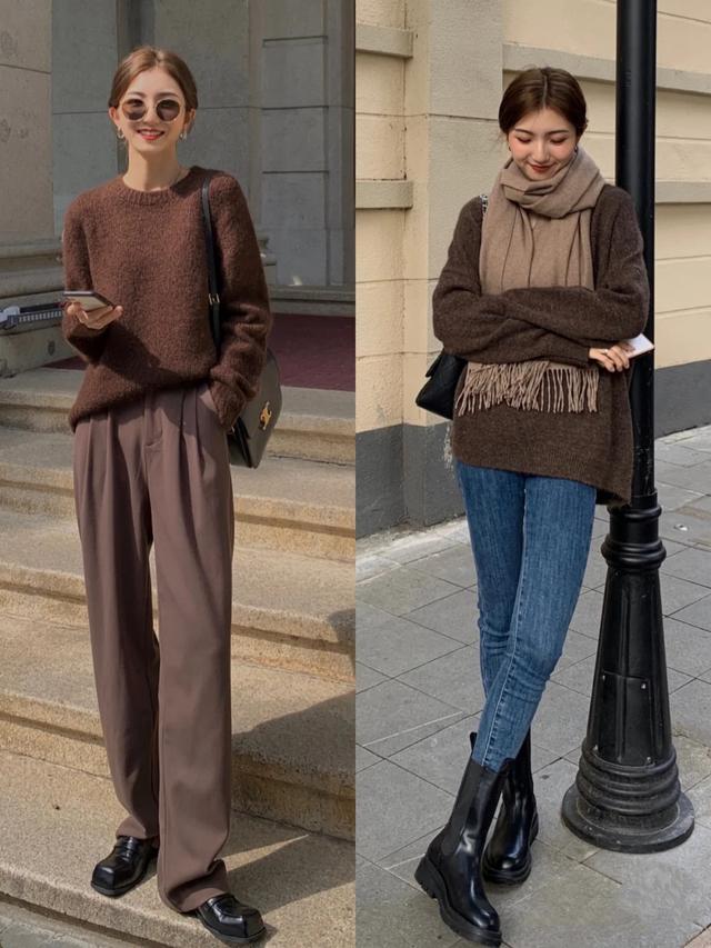 首先,以棕色、驼色或米色为主的针织衫,质地轻柔,结合略微宽松的版型,其强势被诠释为休闲、舒适、气质。棕色毛衣搭配一条同色的裤子,颜色深而丰富但条理分明,超级别致!